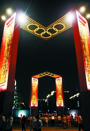走出宿舍,透透氣,我發(fā)現(xiàn)這里還有12個居民服務(wù)中心,里面吃喝玩樂都有。當夜幕降臨,我看到那個奧運村生活區(qū)朱紅大門上燈火輝煌,五環(huán)標志十分醒目。的確,我們是為了奧林匹克精神來到這里。