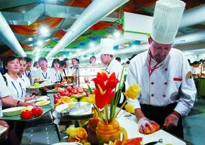 奧運村餐廳堪稱“萬人大食堂”,主餐廳位于居住區(qū)的北側(cè),提供24小時餐飲服務(wù)。記者看到,餐廳設(shè)有四大餐區(qū):國際餐區(qū)、地中海餐區(qū)、亞洲餐區(qū)及中國餐區(qū),還包括猶太餐、清真餐、印度餐等菜品,并有明顯的菜單標(biāo)牌提示,供村民選擇。名聞天下的北京烤鴨也進(jìn)駐了奧運村,運動員每天都可品嘗。餐廳按照70%西餐、30%中餐比例配備菜品,并且菜單8天一個循環(huán)周期。
