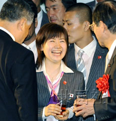 氣氛略顯莊重的成立儀式之后還舉行了輕松歡快的壯行會。因?yàn)橹型緟⒓拥娜毡臼紫喔L锟捣蜻t到,手握麥克風(fēng)的棒球隊(duì)主帥星野仙一(61歲)臨時(shí)救場致辭稱,“我剛才想希望小愛(接旗時(shí))不要倒下,可鈴木一點(diǎn)都沒有幫忙”,引起會場一陣笑聲。