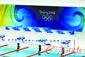 還有10天,2008年北京奧運(yùn)會(huì)即將開(kāi)幕,如今每個(gè)人、每個(gè)場(chǎng)館都進(jìn)入了最后的備戰(zhàn)狀態(tài),尤其是比賽場(chǎng)館基本都處于封閉狀態(tài)。今天,借著難得的中、日花樣游泳公開(kāi)訓(xùn)練機(jī)會(huì)記者有幸再次走進(jìn)國(guó)家游泳館——“水立方”。由于中、日兩隊(duì)臨時(shí)改變訓(xùn)練場(chǎng),這倒讓記者得以好好領(lǐng)略了一下現(xiàn)在的“水立方”內(nèi)部。跳水臺(tái)后面黃色的“祥云”背景、游泳池旁的領(lǐng)獎(jiǎng)臺(tái)以及幾個(gè)巨大的觀賽顯示屏,加上記者席上的液晶顯示器,記者發(fā)現(xiàn),與年初的國(guó)際泳聯(lián)跳水世界杯時(shí)相比,這里變了很多!艾F(xiàn)在我們真正可以說(shuō)隨時(shí)等著比賽了。”“水立方”的看臺(tái)席主管程秀麗信心十足地表示。