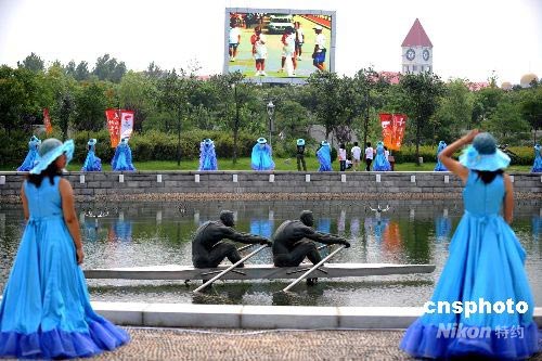 7月30日,奧運(yùn)火炬在河北秦皇島傳遞,在傳遞終點(diǎn)奧林匹克公園,“海浪姑娘”等待火炬手到來。中新社發(fā) 廖攀 攝