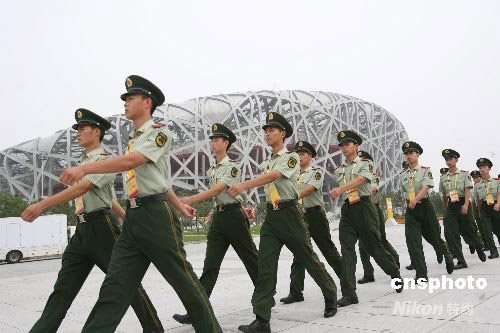 第29屆夏季奧運(yùn)會(huì)開幕式彩排在北京國家體育場“鳥巢”內(nèi)封閉進(jìn)行,武警、特警現(xiàn)場戒備,保安嚴(yán)密。 中新社發(fā) 武仲林 攝