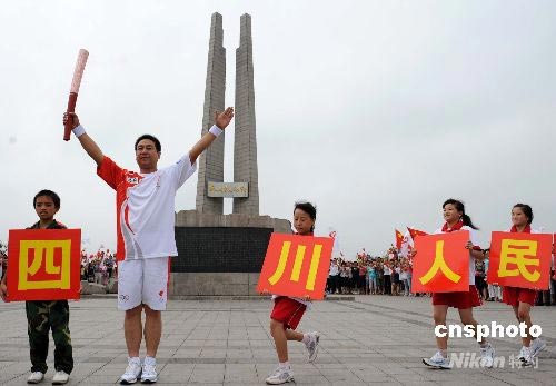 7月31日,奧運(yùn)火炬在河北唐山傳遞。在唐山抗震紀(jì)念碑廣場,火炬手、抗震志愿者宋志永在來自四川震區(qū)的兒童前展示奧運(yùn)火炬。四川地震發(fā)生時(shí)宋志永自發(fā)前往地震災(zāi)區(qū)參與救援行動,徒手刨出5個(gè)遇難孩童的遺體。 中新社發(fā) 廖攀 攝