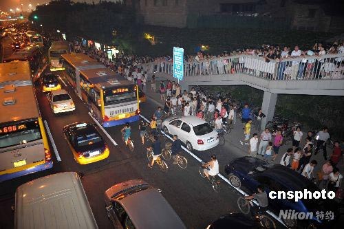 7月30日晚,北京奧運(yùn)開(kāi)幕式帶妝彩排,前來(lái)“鳥(niǎo)巢”觀看的外圍民眾陡增,位于“鳥(niǎo)巢”周邊的北四環(huán)車流人流增大。 中新社發(fā) 陳文 攝