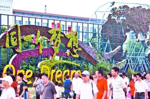 西側(cè)花壇的主題為“改革開放共譜和諧篇章”;▔倍螢椴屎玳T與中國(guó)結(jié)的組合造型,從花山上流下一條五彩的花溪,花溪鑲嵌有象征56個(gè)民族的56朵花和為廣大群眾熟悉的心手相連圖案,寓意全國(guó)人民萬(wàn)眾一心、眾志成城、同心同德、團(tuán)結(jié)奮斗建設(shè)社會(huì)主義和諧社會(huì)。同時(shí)也寓意心手相連、抗震救災(zāi)的決心。南段花壇通過(guò)杭州灣大橋、嫦娥奔月工程、北京新地標(biāo)性建筑和農(nóng)業(yè)豐收景象,體現(xiàn)我國(guó)改革開放30年來(lái)取得的巨大成就。