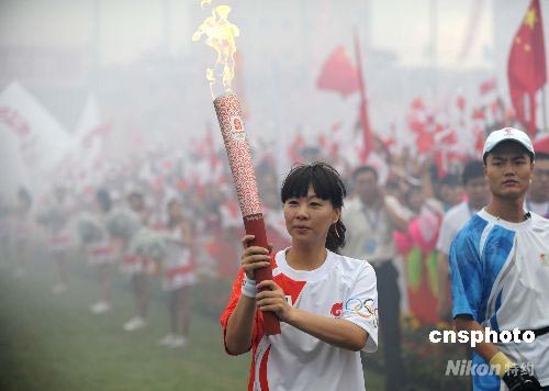 7月31日8點(diǎn)10分,曾獲得30個(gè)全國(guó)冠軍、51個(gè)世界冠軍、第25屆巴塞羅那奧運(yùn)會(huì)女子100米蝶泳冠軍錢紅高舉“祥云”火炬在唐山體育中心主田徑場(chǎng)起跑,北京奧運(yùn)火炬接力河北省傳遞活動(dòng)的最后一站——唐山火炬?zhèn)鬟f活動(dòng)正式開(kāi)始。中新社發(fā) 廖攀 攝
