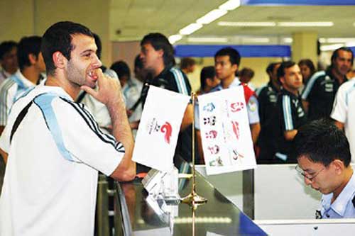 飛機(jī)比預(yù)定的時(shí)間晚到了幾分鐘,11時(shí)45分,阿根廷國(guó)奧隊(duì)的運(yùn)動(dòng)員走出機(jī)艙,他們談笑風(fēng)生,顯得非常輕松。通過檢測(cè)體溫區(qū)域后,馬斯切拉諾第一個(gè)站到了邊檢驗(yàn)證臺(tái)前!澳茫 边厵z民警用西班牙語向這位著名球員表示問候,并很快幫他辦理了入境通關(guān)手續(xù)。