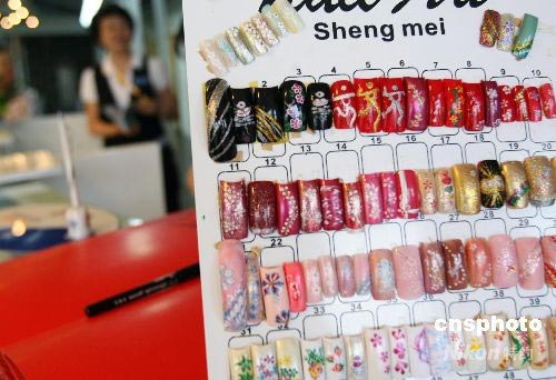 北京奧運會開幕在即,奧運村國際區(qū)美發(fā)沙龍?zhí)峁┯小爸袊 眻D案的美甲服務,別有中國特色。中新社發(fā) 武仲林 攝