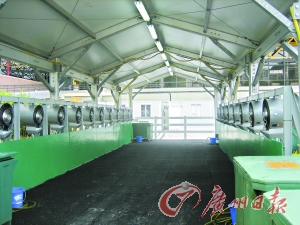 在房間內(nèi),馬匹可以“嘆空調(diào)”,在室外怎么辦呢?記者在幾個室外練習(xí)場的旁邊看到了兩座降溫站,所謂降溫站,就是用一種特殊的風(fēng)扇將水吹成霧狀,霧狀的水噴到馬兒的身上,能夠起到降溫的作用。一位工作人員向記者介紹,如果馬匹需要迅速將體溫降下來,則可使用水槍,他交給記者試了一下,水量很大卻柔和,既能給馬匹迅速降溫,也不至于噴力太大驚嚇到馬匹。為了應(yīng)付高溫的天氣,降溫站的旁邊儲存了大量的冰塊,降溫使用的水都是冰塊融化后的冰水,降溫效果十分明顯。工作人員還告訴記者,他們24小時都得值班,因?yàn)橛行T手喜歡晚上訓(xùn)練,有些騎手則喜歡早起訓(xùn)練,都是為了避開高溫天氣。