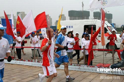 8月1日,奧運(yùn)火炬在天津?yàn)I海新區(qū)傳遞,著名電影演員、笑星葛優(yōu)擔(dān)任第190棒火炬手傳遞奧運(yùn)火炬。中新社發(fā) 郭曉帆 攝