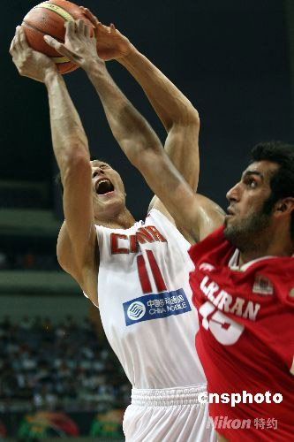 圖為中國隊(duì)11號(hào)易建聯(lián)(左)在比賽中。