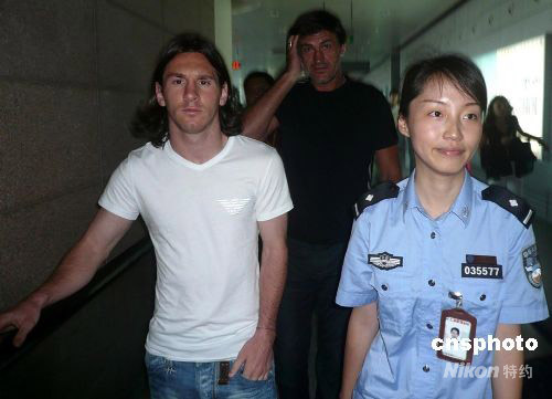 八月一日,阿根廷足球明星梅西(左),搭乘法航一一六次航班飛抵上海,在安保人員陪同下走出候機(jī)樓,與先期抵達(dá)的阿根廷國(guó)奧隊(duì)匯合,備戰(zhàn)將于八月七日開始的北京奧運(yùn)會(huì)足球上海賽區(qū)比賽。 中新社發(fā) 劉友平 攝