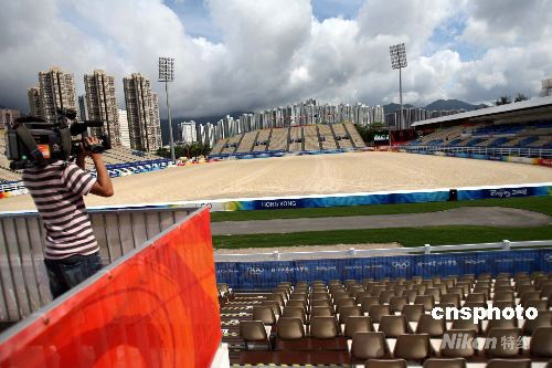 八月一日,香港奧運馬術(shù)公司在沙田賽場舉行記者會,讓記者在賽場內(nèi)了解場館規(guī)則。首場奧運馬術(shù)賽將在八月九日上午六點三十分開賽。 中新社發(fā) 洪少葵 攝