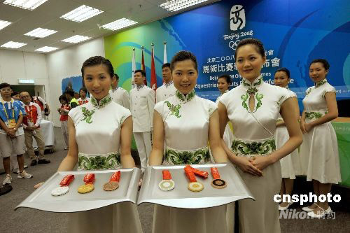 八月二日,擔任奧運馬術的禮儀小姐及升旗手,在香港沙田奧運馬術比賽場地的媒體中心首度會見媒體,并展示奧運馬術賽事的獎牌。 中新社發(fā) 鄧慶樂 攝