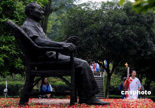 圖:女排選手陳靜在鄧小平銅像前傳遞奧運火炬