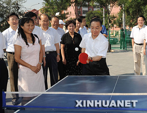 豐臺區(qū)大井社區(qū)位于豐臺體育中心一側(cè)。近年來,通過舊樓改造、建設(shè)綠地等措施,居民生活環(huán)境明顯改善。上午9時許,溫家寶一行來到這個社區(qū),看到這里樓新路寬環(huán)境美,居民還有自己的健身場所,許多人正在這里活動,他十分高興,便興致勃勃地和群眾打起了乒乓球。