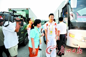 馮坤(中)走下大巴,進(jìn)入奧運(yùn)村。