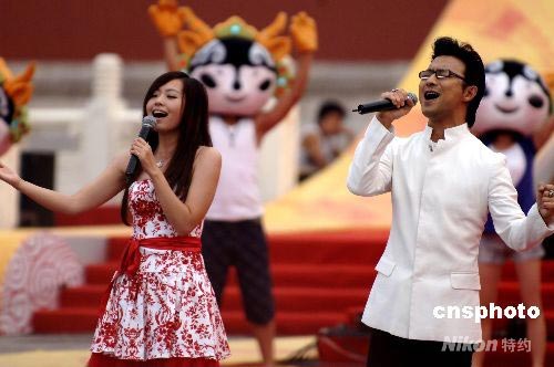 8月6日上午,奧運(yùn)火炬?zhèn)鬟f北京站從午門(mén)正式開(kāi)始傳遞。圖為張靚穎、汪峰在傳遞現(xiàn)場(chǎng)放歌。中新社發(fā) 王東明 攝