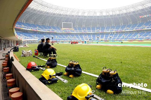 圖為天津“水滴”體育場內(nèi)加強安保工作。 中新社發(fā) 陳文 攝