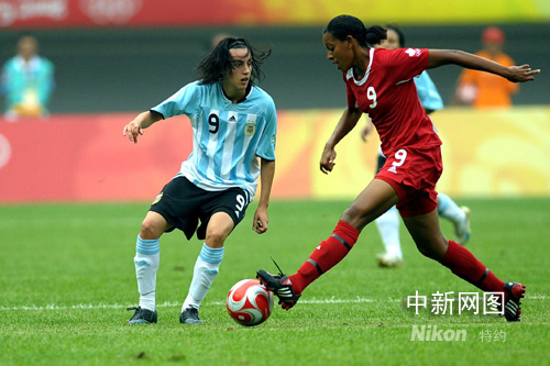 8月6日下午,奧運(yùn)女足在天津“水滴”體育場拉開戰(zhàn)幕,首場比賽阿根廷女足迎戰(zhàn)加拿大。加拿大女足9號坎達(dá)斯·查普曼上半場先攻進(jìn)一球。中新社記者 陳文 攝