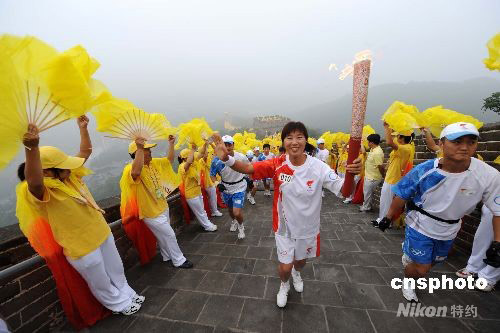 8月7日上午,奧運(yùn)火炬在北京八達(dá)嶺長城傳遞。圖為第10棒火炬手祁艷霞傳遞火炬。 中新社發(fā) 廖攀 攝