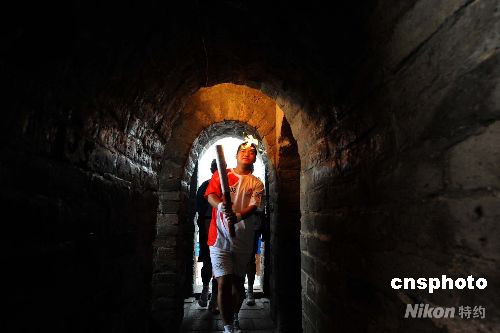 8月7日上午,奧運(yùn)火炬在北京八達(dá)嶺長(zhǎng)城傳遞,第8棒火炬手顧崇華手持燃燒的奧運(yùn)火炬穿越烽火臺(tái)。 中新社發(fā) 廖攀 攝