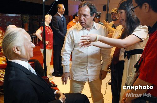 圖為國際奧林匹克博物館館長加貝特觀賞中國蠟像藝術作品。