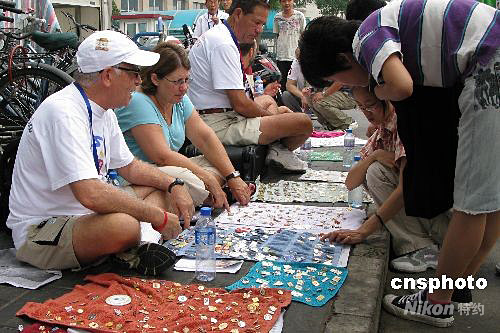 八月七日,在北京國際新聞中心附近,幾名外國游客擺起了約五米長的地攤兒,與中外游客交換奧運(yùn)徽章。 中新社發(fā) 杜燕 攝
