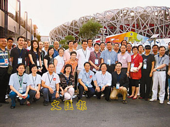 以香港文匯報社長張國良為團長的香港新聞界訪京團抵京率先察看奧運之旅。圖為訪京團成員在鳥巢前合照。(圖片來源:文匯報)