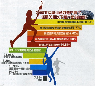 本次問卷調(diào)查結(jié)果顯示,群眾最擔(dān)心的問題,排在前三位的是:“奧運(yùn)文明風(fēng)一吹而過”(2668票,占總59.29%)、“奧運(yùn)期間一些好的政策難以持續(xù)”(2081票,占總46.25%)、“國(guó)際社會(huì)對(duì)北京奧運(yùn)會(huì)的評(píng)價(jià)不高”(1654票,占總36.76%)。而對(duì)“奧運(yùn)之后經(jīng)濟(jì)發(fā)展速度放緩”、“辦奧運(yùn)可能入不敷出”、“北京的房?jī)r(jià)將大幅下跌”等問題,均占受調(diào)查者的35%以下。