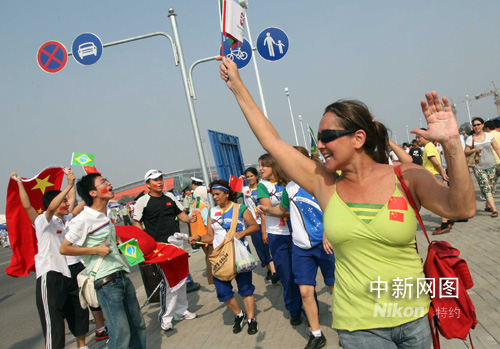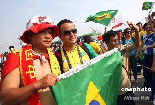 8月7日,巴西、中國(guó)球迷在北京奧運(yùn)沈陽足球分賽場(chǎng)歡呼。當(dāng)晚,男足巴西對(duì)比利時(shí)、中國(guó)對(duì)新西蘭將進(jìn)行小組賽。中新社發(fā) 張宇 攝