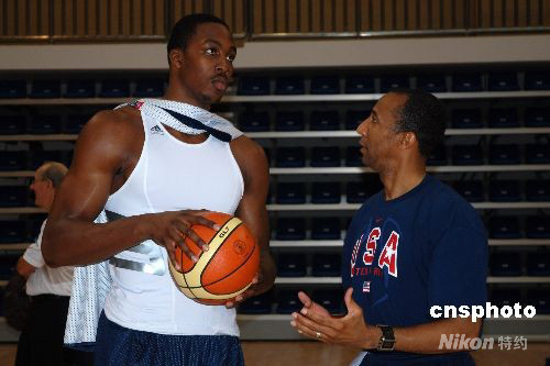 8月7日中午,美國(guó)男籃“夢(mèng)八隊(duì)”開始了抵京后的首次訓(xùn)練。圖為“魔獸”中鋒霍華德與發(fā)球教練進(jìn)行交流。中新社發(fā) 賴松 攝