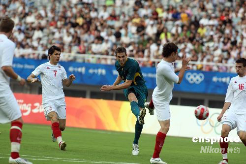 8月7日,北京奧運會男子足球預(yù)賽A組,澳大利亞對塞爾維亞的比賽在上海體育場進行。最終,澳大利亞1:1戰(zhàn)平塞爾維亞,雙方握手言和。圖為澳大利亞5號選手SPIRANOVIC Matthew在多位防守隊員包圍下起腳射門。中新社發(fā) 湯彥俊 攝