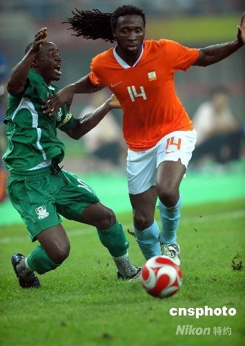 8月7日晚,在天津“水滴”體育場奧運男足小組賽上,荷蘭隊員14號埃萬德-斯諾場上嚴重犯規(guī)被紅牌罰下場。圖為荷蘭14號隊員場上突破。中新社發(fā) 陳文 攝