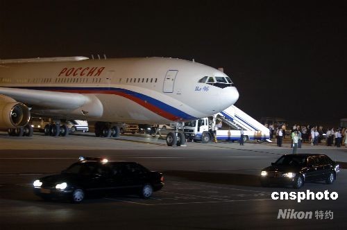 8月7日晚,俄羅斯總理普京抵達(dá)北京首都機(jī)場,將參加奧運(yùn)會開幕式。圖為其專車(右)從其專機(jī)前駛過。中新社發(fā) 王東明 攝