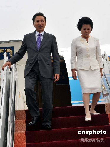 韓國總統(tǒng)李明博8月8日上午9 時許抵達北京,將出席北京奧運會開幕式及相關(guān)活動。 中新社發(fā) 宋吉河 攝