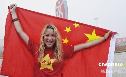 8月8日,澳大利亞女孩“中中”在北京天安門(mén)廣場(chǎng)前身披中國(guó)國(guó)旗,慶賀北京奧運(yùn)的來(lái)臨。中新社發(fā) 王宇婷 攝