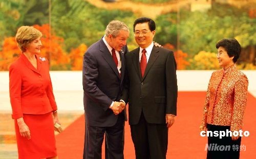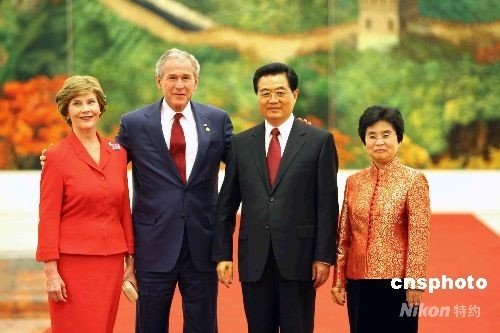 圖:胡錦濤夫婦歡迎美國總統(tǒng)布什夫婦
