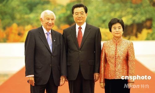 8月8日中午,中國國家主席胡錦濤和夫人劉永清在北京人民大會堂為出席北京奧運會的貴賓舉行歡迎宴會。圖為胡錦濤夫婦歡迎國際奧委會名譽主席薩馬蘭奇。中新社發(fā) 任海霞 攝