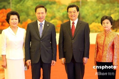 8月8日中午,中國國家主席胡錦濤和夫人劉永清在北京人民大會(huì)堂為出席北京奧運(yùn)會(huì)的貴賓舉行歡迎宴會(huì)。圖為胡錦濤夫婦歡迎韓國總統(tǒng)李明博夫婦。中新社發(fā) 任海霞 攝
