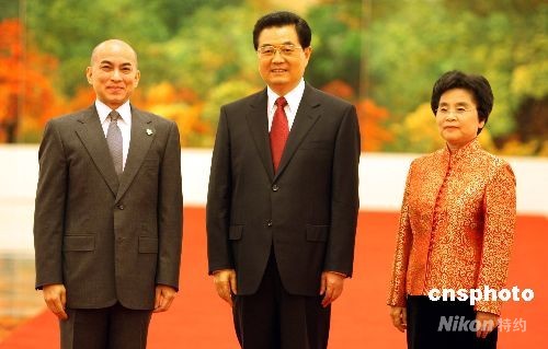 圖:胡錦濤夫婦歡迎柬埔寨國王西哈莫尼