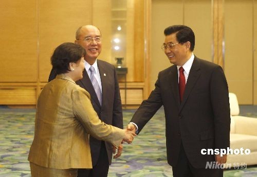 8月8日,中共中央總書記胡錦濤在北京會見中國國民黨主席吳伯雄。中新社發(fā) 盛佳鵬 攝