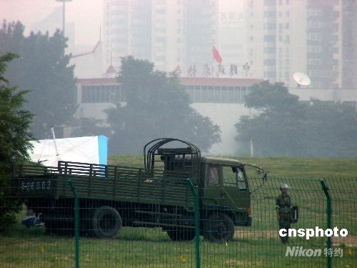 8月8日,新駐“鳥巢”周圍的中國武警防暴部隊(duì)嚴(yán)陣以待,保衛(wèi)北京奧運(yùn)會(huì)開幕式的安全。包括解放軍三軍將士和保安、民兵、警察和武警在內(nèi)的多支武裝力量在此駐守,維護(hù)“鳥巢”周邊地面安全。中新社發(fā) 賈國榮 攝