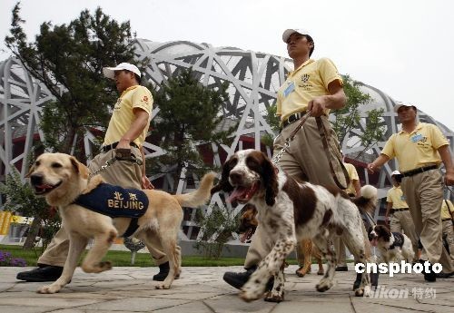 8月8日,第29屆夏季奧運會將于當(dāng)晚在北京奧林匹克公園內(nèi)的國家體育場開幕,為保證開幕式的順利進(jìn)行,“鳥巢”周邊安保措施升級。圖為搜爆犬在“鳥巢”周邊搜爆。