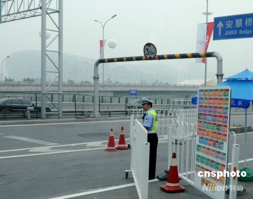 八月八日,北京“鳥巢”體育場外圍的警察在貼有各種車輛通行證的指示牌前,負(fù)責(zé)疏導(dǎo)參加北京奧運(yùn)會(huì)開幕式的交通。中新社發(fā) 賈國榮 攝