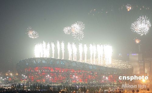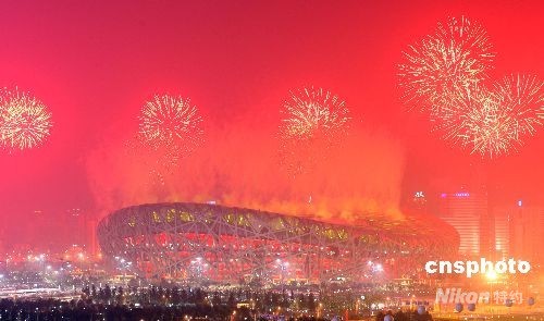 八月八日晚,第二十九屆奧林匹克運(yùn)動會在北京開幕,煙花映紅北京夜空。中新社發(fā) 毛建軍 攝
