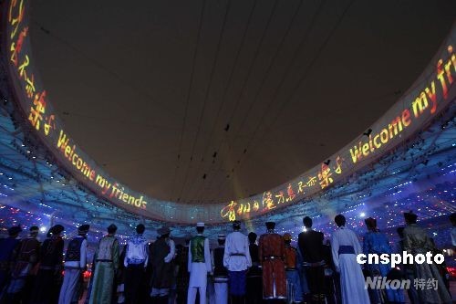 8月8日,第29屆夏季奧運會在北京奧林匹克公園內(nèi)的國家體育場“鳥巢”舉行。圖為“有朋自遠方來,不亦悅乎”的銘言被投射在“鳥巢”上方。中新社發(fā) 杜洋 攝