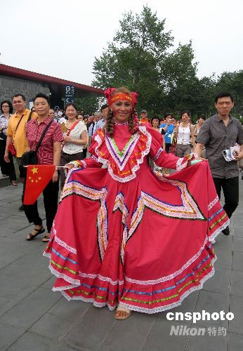 八月八日,北京奧運(yùn)會開幕式在“鳥巢”舉行。下午五時許,在北京十號線地鐵北土城的奧運(yùn)安檢出口,來自墨西哥的美女當(dāng)街盛裝熱舞。中新社發(fā) 許曉青 攝