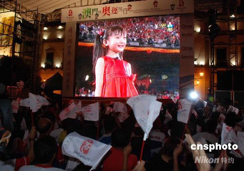 八月八日晚,澳門市民在議事亭前地通過大屏幕觀看北京奧運(yùn)會(huì)開幕式,不時(shí)發(fā)出陣陣歡呼。 中新社發(fā) 畢永光 攝