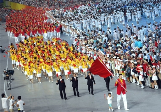 8月8日第29屆奧運(yùn)會(huì)開幕,中國代表團(tuán)入場,旗手為姚明,和姚明一同牽手進(jìn)入會(huì)場的是獲得英雄少年的光榮稱號(hào)的四川省阿壩州少年。